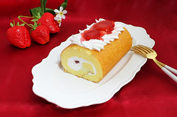 スポンジでホイップクリームと苺ソースをくるっと巻き、ごろっと苺と苺ナパージュ、真っ白なホイップクリームでデコレーションをしました。ほどよい甘さのホイップクリームと甘酸っぱい苺のバランスが良いロールケーキです。